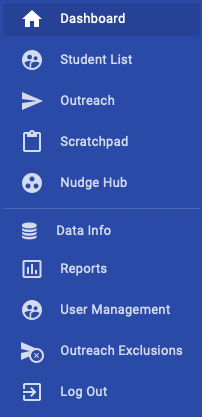 Administrative Analytics uses a global sidebar that separates the staff functions (above the line) from the admin functions (below the line). What you see depends on your user permissions: