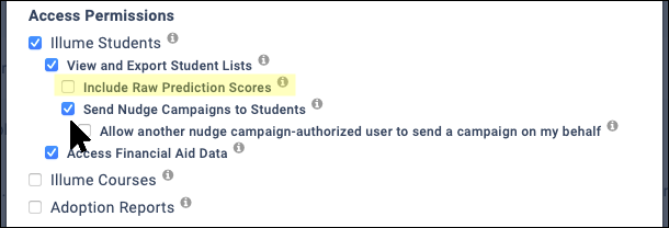 You can give or remove access to students’ raw prediction probability value. This permission is intended for institutional research and analytics teams who need these prediction values for additional research.