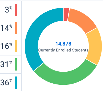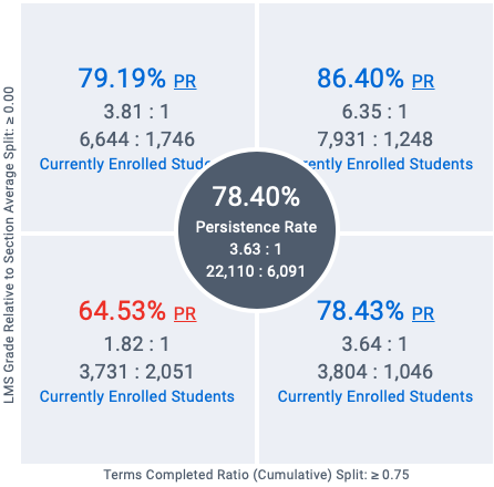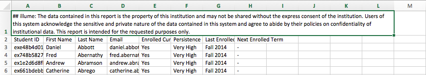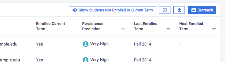 If a user is given access to view and export student lists, they will be able to access and download lists of students to identify currently enrolled students that meet the selected filter criteria. These lists include each student’s ID, name, email, enrollment status, persistence and completion predictions, and the last and next terms enrolled.