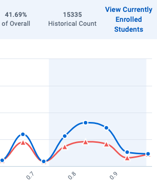 From the Dashboard, look at the Prediction Distribution (pie) chart. Select the number in the center to open the student list. | Highlight a range of a Powerful Predictor’s probability density chart. At the right end of the bar, select View Currently Enrolled Students to open that student list. | In any quadrant of a Paired Predictor Plot, select Currently Enrolled Students (located below the ratios) to open that quadrant’s student list. |