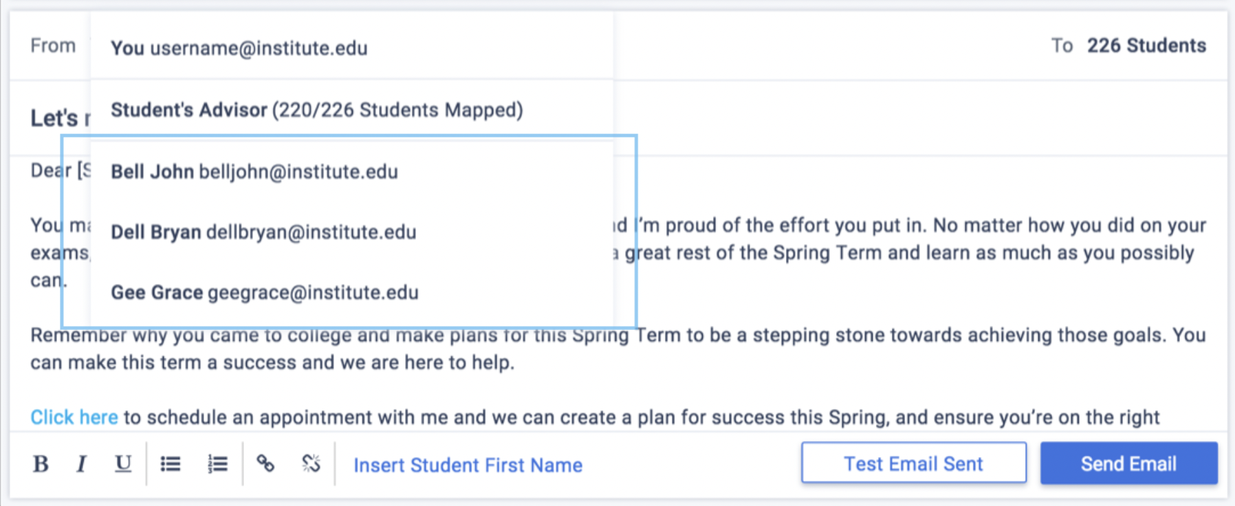 To send a nudge on behalf of another user, open a student list and select the Outreach button. From the pop-up window, locate the From field and select the drop-down arrow. Select the name and email address of the user who will appear be the sender:
