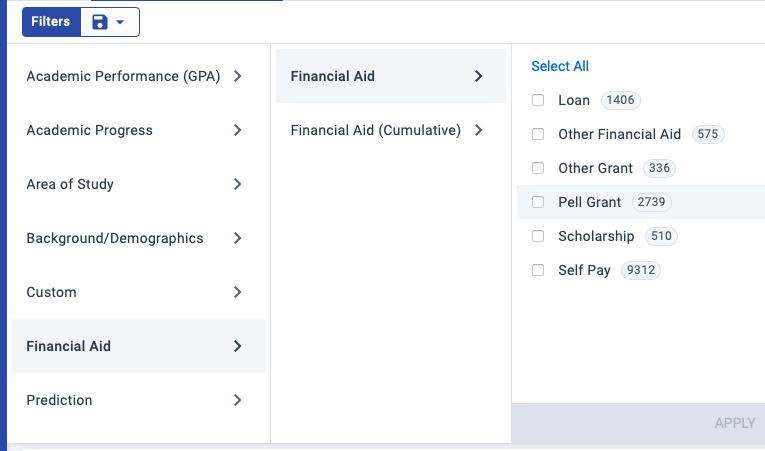 If a user is given access to access financial aid data, they will be able to access Financial Aid filters and Powerful Predictors. This permission ensures that users who are authorized to see financial aid data can explore financial aid insights. By default, this permission is turned off and must be actively selected to enable permission to access financial aid data.