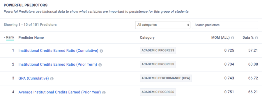See what variables are most predictive for your institution's students, enabling you to focus initiatives on the Powerful Predictors with the greatest potential impact.