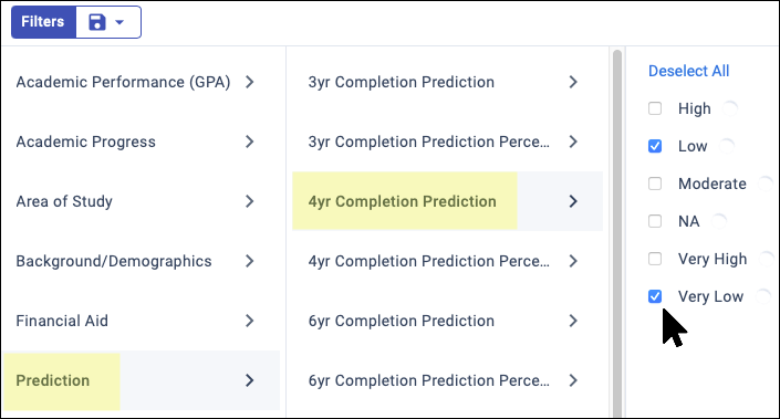 In addition, each Student List includes individualized prediction columns for both Persistence and Completion, for easy tracking and comparison. You can also filter on this prediction data: