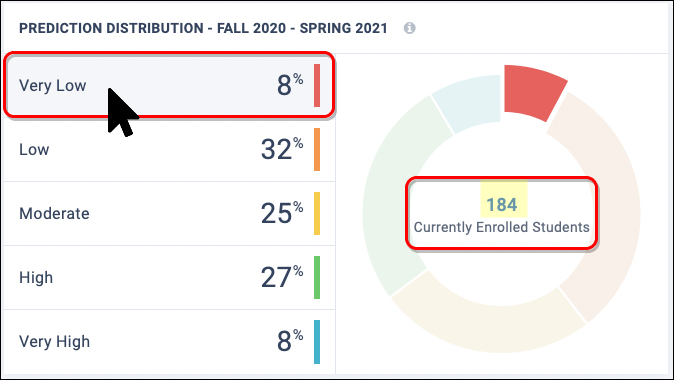 The Prediction Distribution includes only those students who meet the active filter criteria. When no filters have been applied, the Prediction Distribution represents the full set of active (currently enrolled) students.