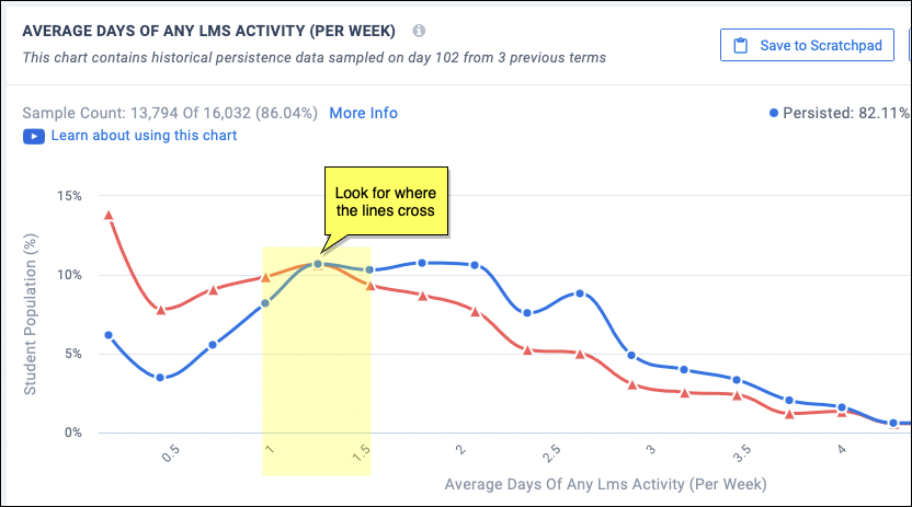 To find a key insight, look for tipping points, where the lines cross (where persistence and non-persistence flip). For example, this predictor is showing that successful students are those who log into the LMS more that once a week: