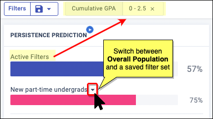Active Filters: The percentage of currently enrolled students meeting the selected filter criteria predicted to enroll in the future term and stay enrolled.