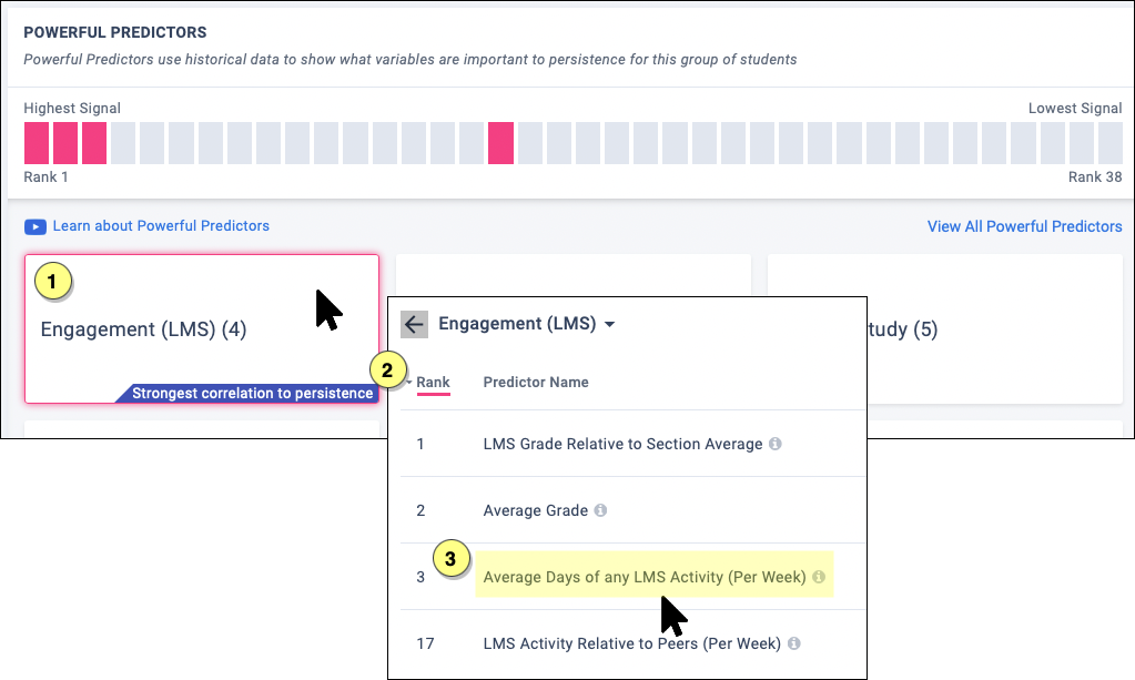 Each Powerful Predictor is a predictive factor or behavior for the filtered student group. These variables are specific to your institution, based on which indicators are proven most helpful in predicting persistence for your unique student population. They appear in order of predictive power, and you can select them to open the specific predictors (data columns) that make up the Powerful Predictor: