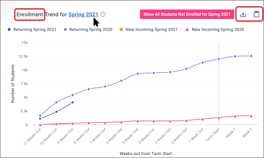 Hover over a point on the graph to review enrollment data for returning and new incoming students.