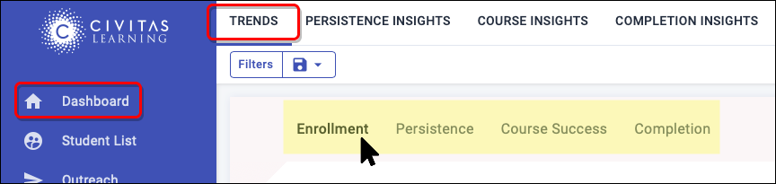 Review enrollment patterns for key groups — Use filters at the top of the page to investigate enrollment patterns for a key student population.